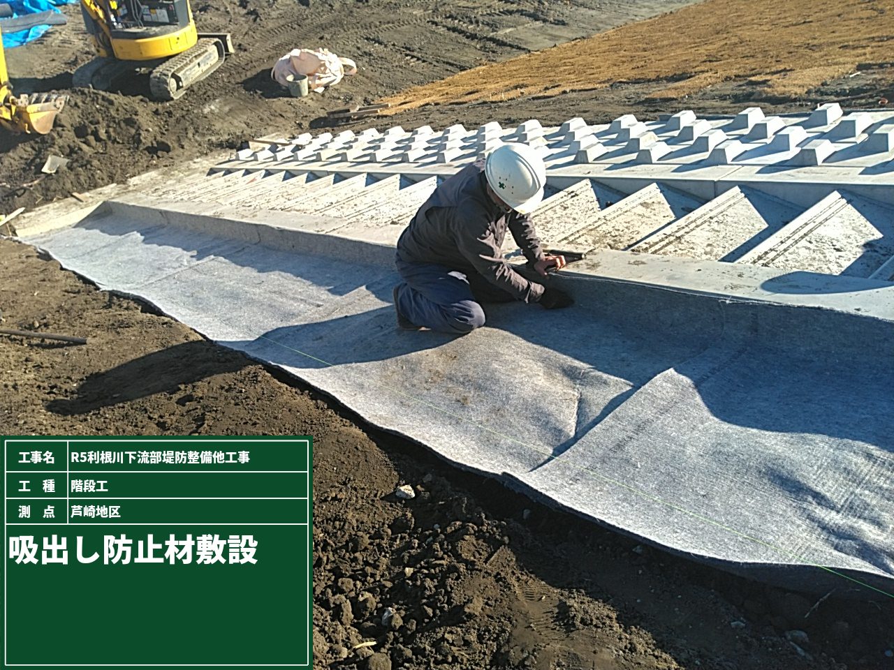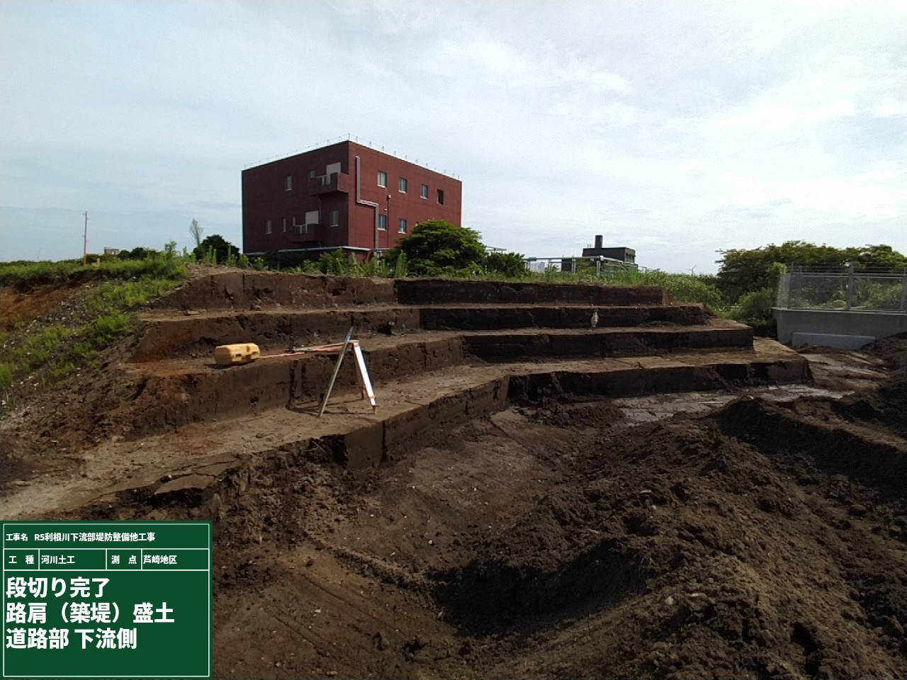 まずは「段切り」と言って堤防法面に水平面切土をおこなって、盛土と地山のなじみを良くするための盛土をします。