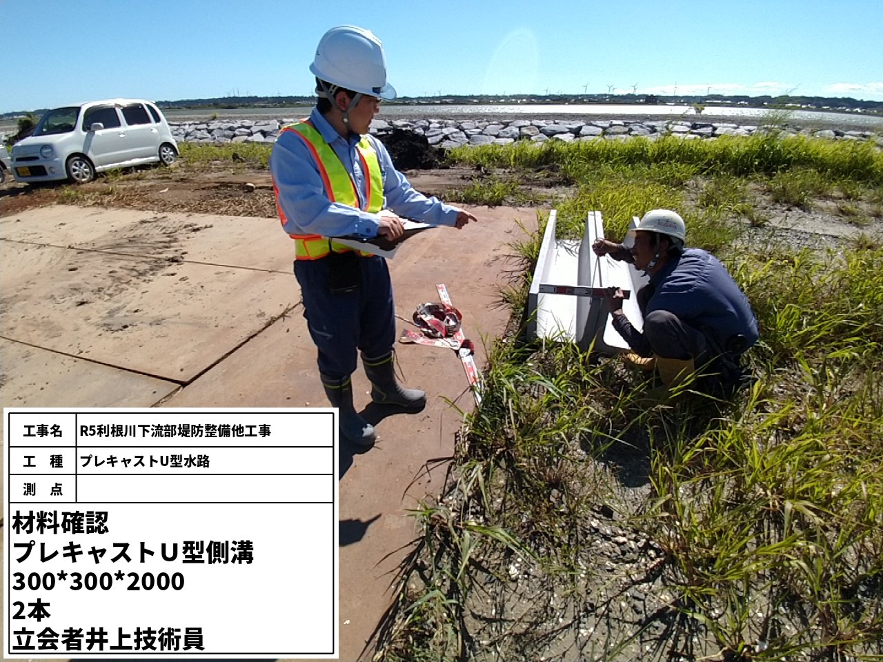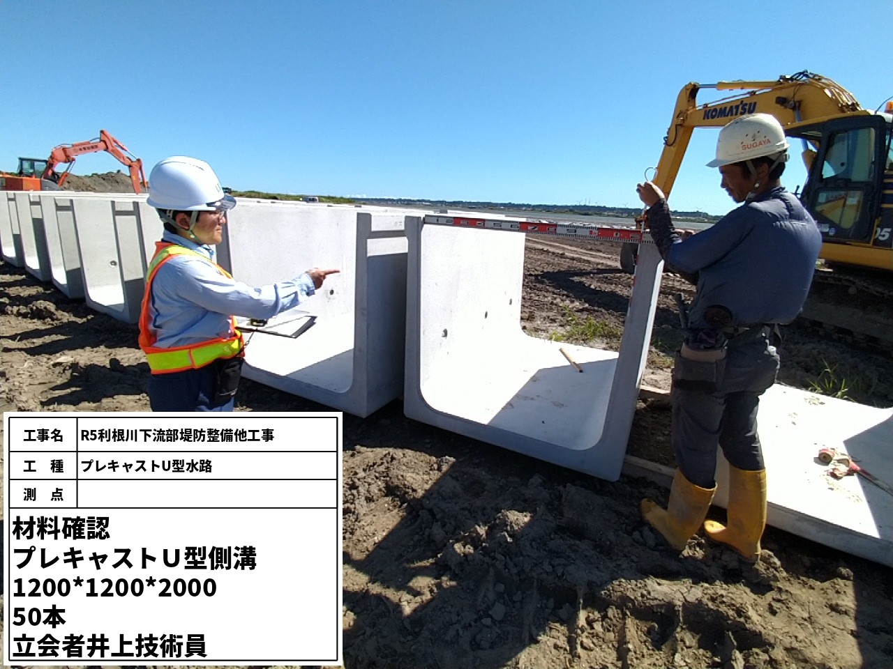 こちらも側溝はPC(プレキャスト)製品を使用するので、現場に納入された材料にサイズ違いなどがないかを確認します。
