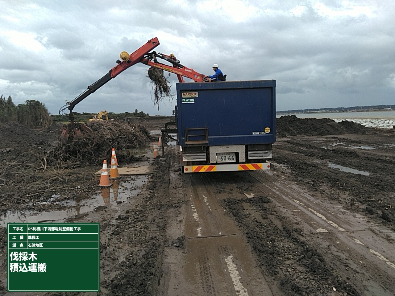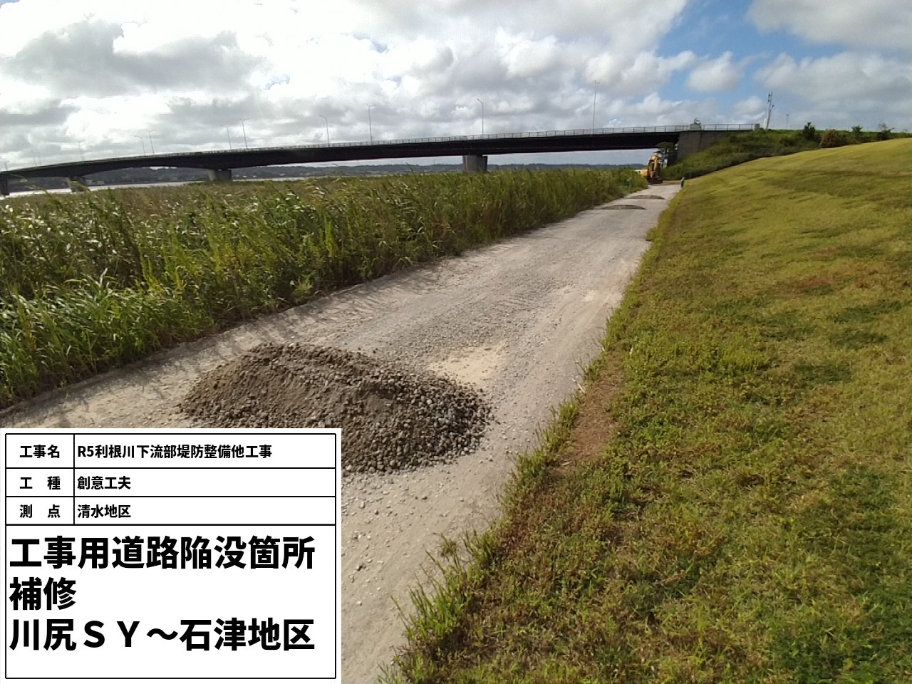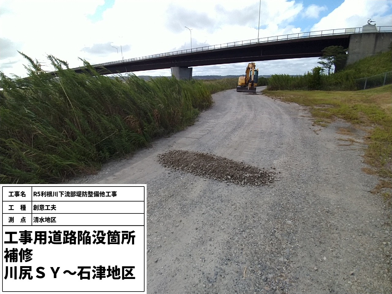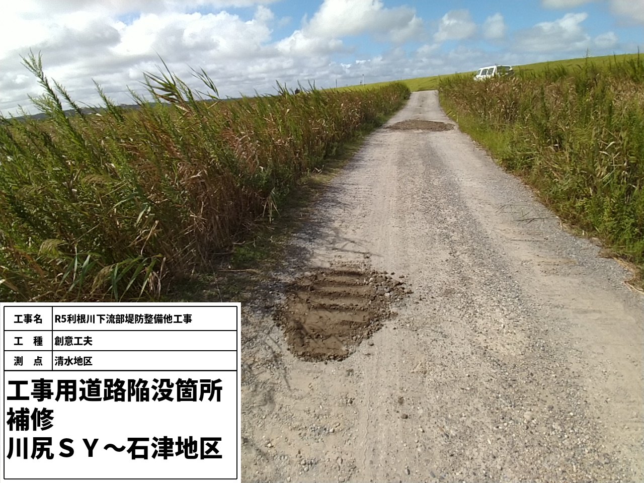 今回は材料を保管しているストックヤードから石津地区の施工場所までの工事用道路が陥没していたので、直接の施工場所とは違いますが陥没箇所を補修しました。