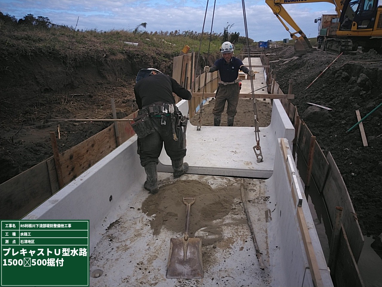 石津地区で使用したU型側溝よりも幅が広くて大きいですね。重機で吊るのもバランスを崩さない様に注意します。