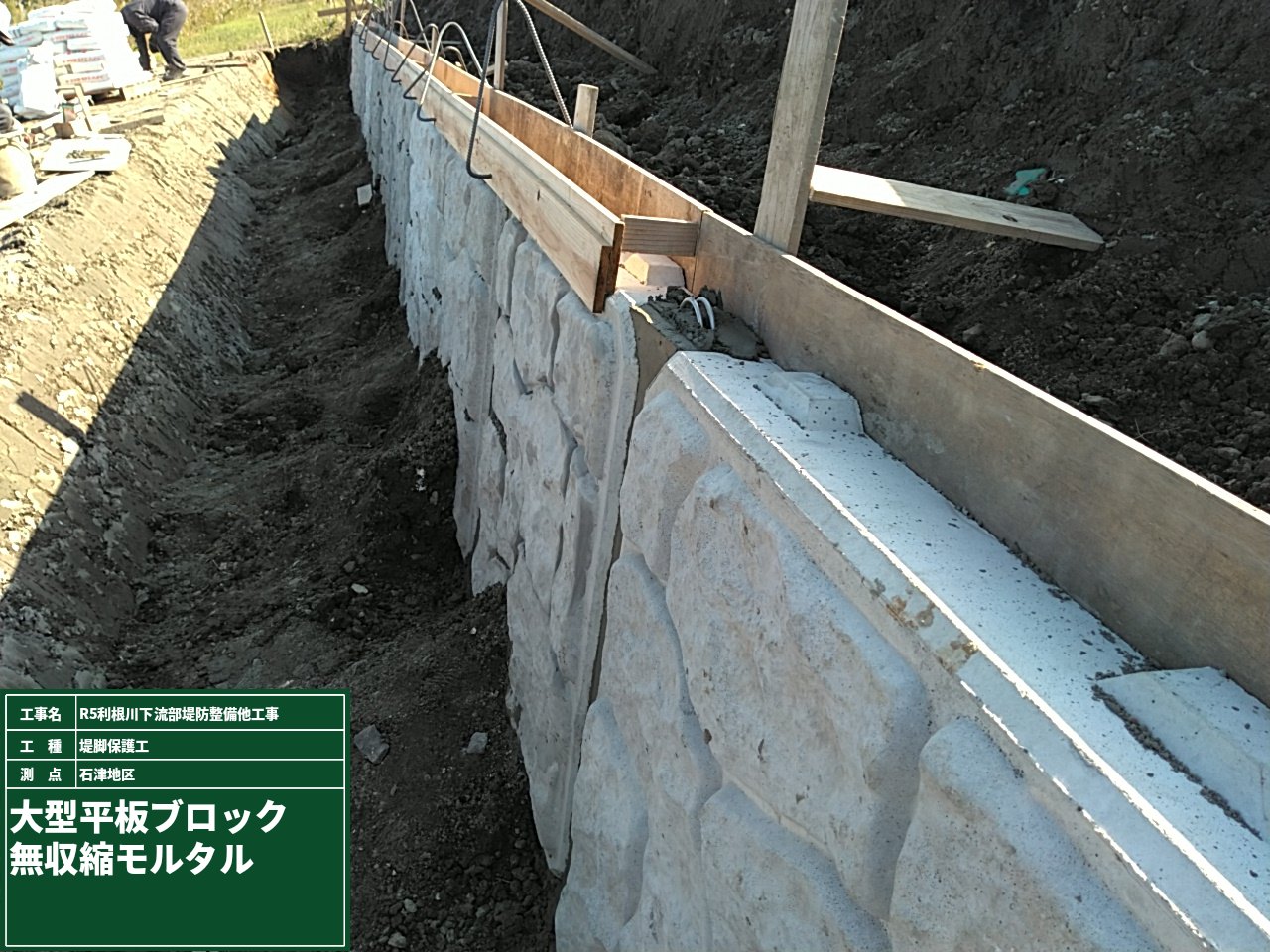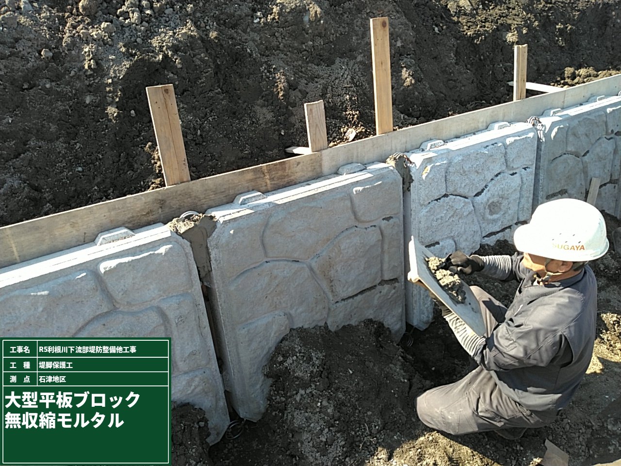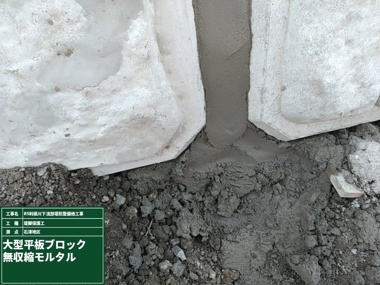 平板ブロックの間を無収縮モルタルで埋めていきます。